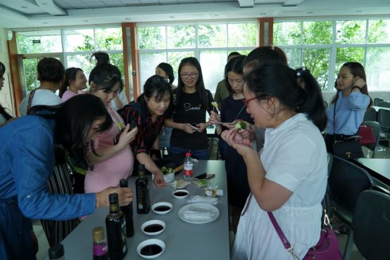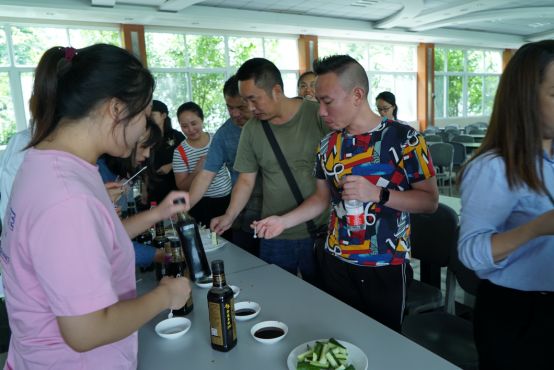 在经过短暂午休之后,千禾接待人带领我校学员现场品鉴千禾明星产品(零添加:有机酱油、有机醋、窖醋10年、窖醋5年、头道原香酱油等)。学员和千禾味业产品经理樊经理进行交流讨论会,互相沟通分享,让现场氛围持续高涨。